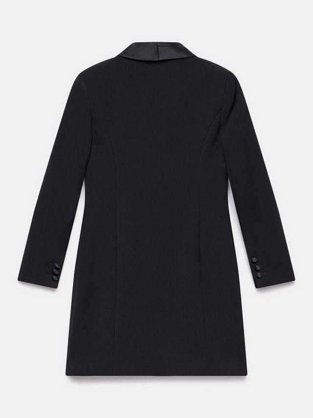 Мини-платье-блейзер с воротником с бахромой на лацканах, длинными рукавами, манжетами на пуговицах и прорезными карманами с застежкой спереди.