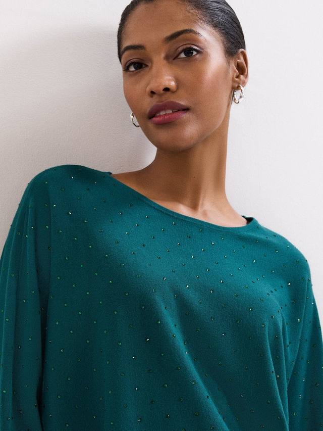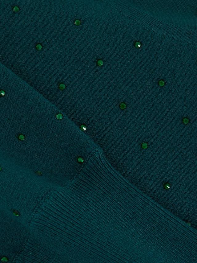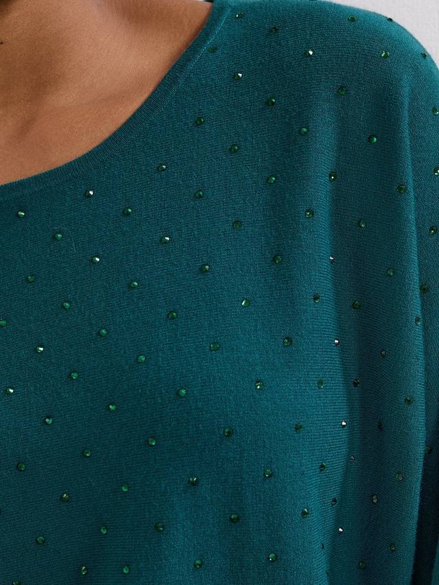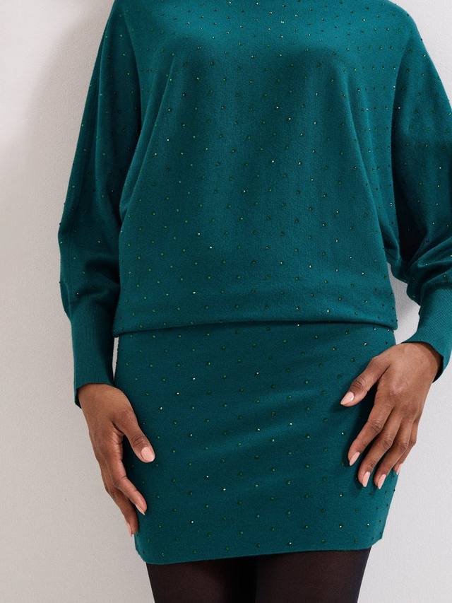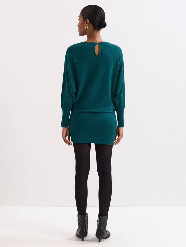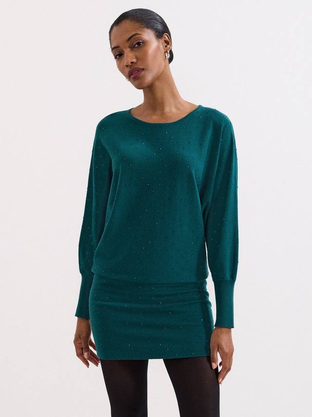 Эта модель мини-джемпера состоит из облегающей юбки в рубчик и свободного кроя, подчеркнутого женственным вырезом-клеш. Эта игривая модель, украшенная заклёпками, которые переливаются на свету, идеально подходит для праздничного сезона с колготками и ботильонами или туфлями на каблуках.
