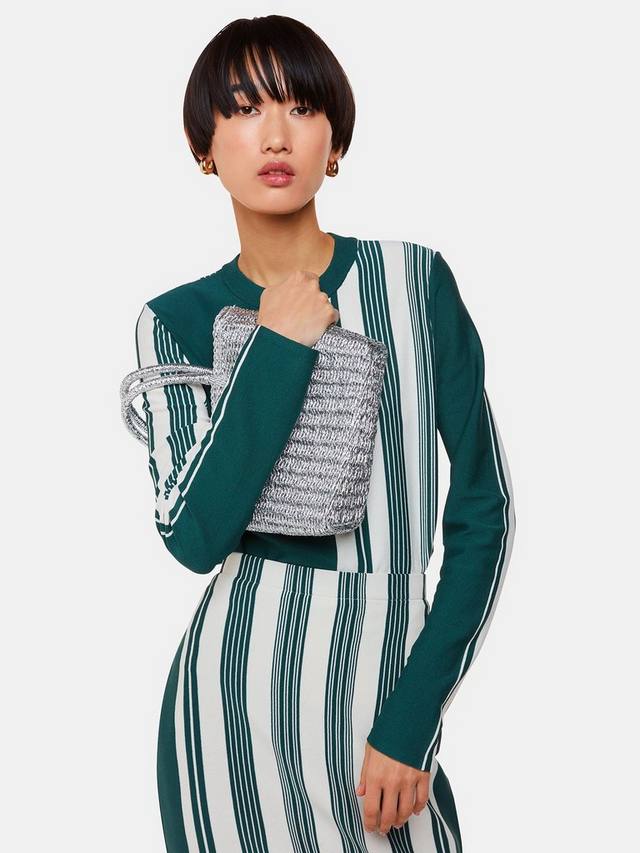 Сплетенная из металлизированных материалов и оснащенная мягким ремешком, она имеет открытый верх для доступа.