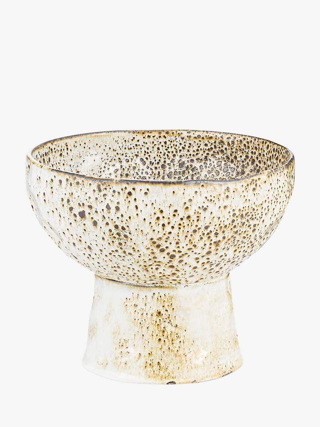Привлекательная органичная форма идеально сочетается с неровной и разнообразной отделкой реактивной глазури. Мягкие, крапчатые коричневые оттенки тонко сочетаются с привлекательной кремово-белой глазурью, создавая потрясающий эффект, а приподнятая подставка превращает чашу в яркий экспонат, будь то отдельно стоящая декоративная чаша или для более практичного использования.