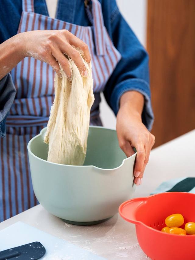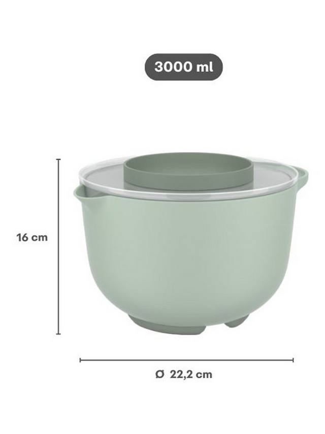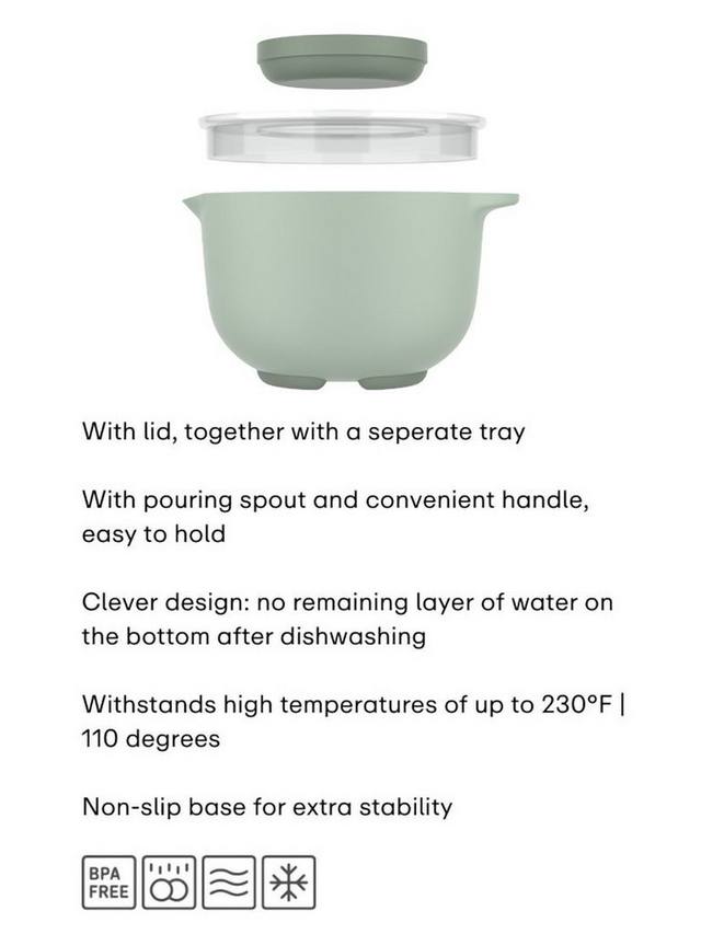 Миска оснащена практичным носиком и прочной ручкой, что делает ее идеальной для приготовления теста, кляра или соусов. Крышка с защитой от брызг и отдельным поддоном позволяет легко закрыть миску и сохранить содержимое свежим в холодильнике.