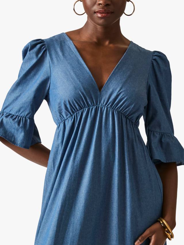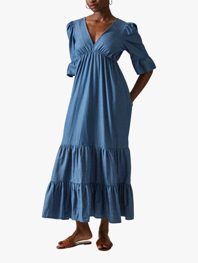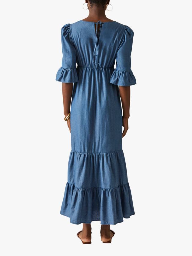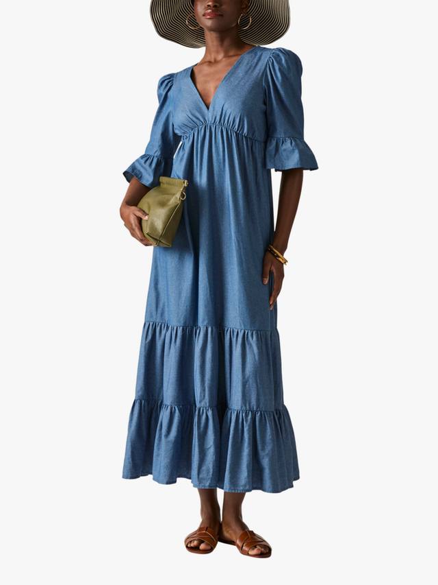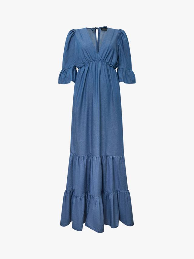 Откройте для себя макси-платье из джинсовой ткани с оборками и многоуровневым лифом от James Lakeland. Идеально подходит для повседневных прогулок или летних мероприятий. Платье с V-образным вырезом, сборкой выше талии, расклешенными рукавами три четверти, многоуровневой юбкой и застежкой сверху. Изготовлено из хлопка для максимального комфорта и элегантности.
