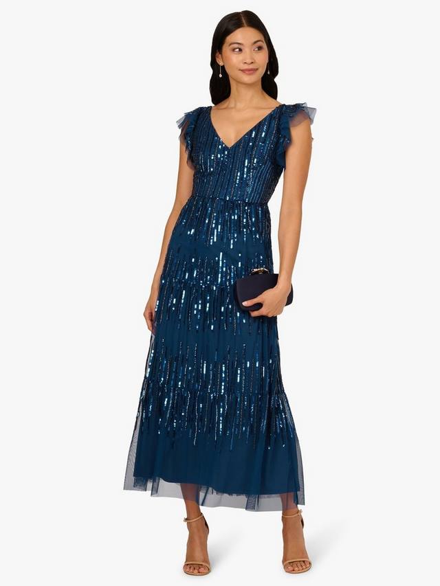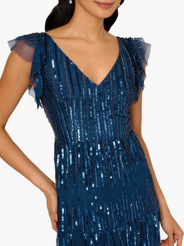 Выразите себя в этом захватывающем вечернем платье с широким V-образным вырезом и нежными прозрачными рукавами-крылышками, создающими мечтательный образ. Мягкий А-образный силуэт обеспечивает грациозность движений, а мерцающие линейные бусины и пайетки создают ослепительный эффект с любого ракурса. Волан добавляет объем, делая каждый шаг непринужденно элегантным. Застежка на молнию сзади обеспечивает идеальную посадку. Это платье станет идеальным выбором для вашего следующего официального мероприятия.