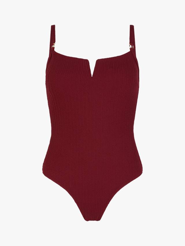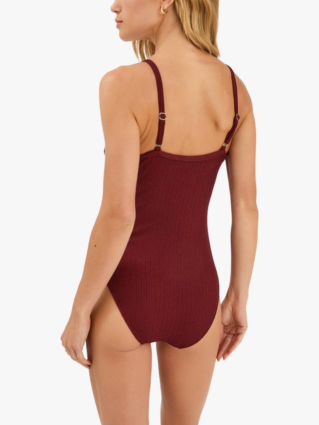 Купальник из ткани сирсакер, V-образный вырез спереди и золотистые кольца на бретельках.