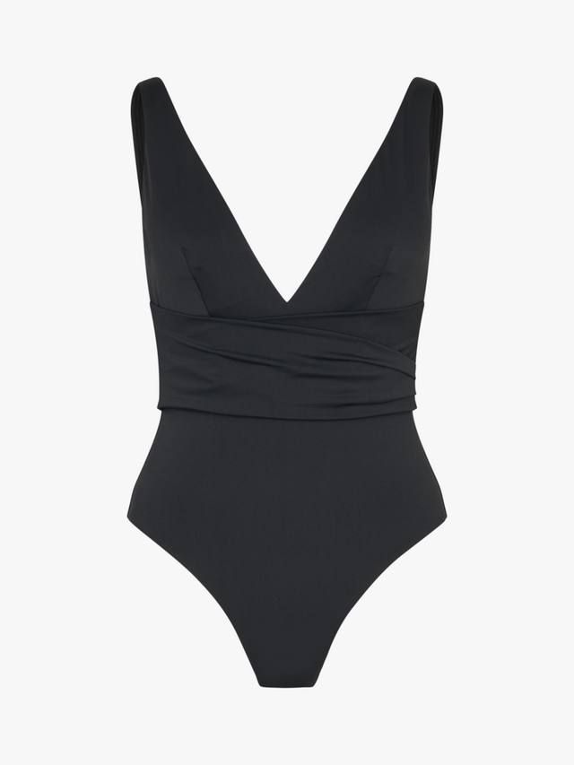 Пора бронировать спа-отдых. Этот купальник с глубоким вырезом изготовлен из прочного эластичного материала и дополнен широкой резинкой на талии, которая сглаживает и корректирует фигуру.