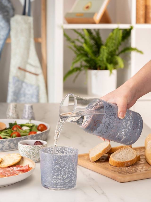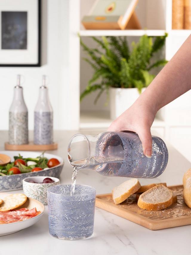 Этот графин и стакан, изготовленные из выдувного стекла ручной работы, будут элегантно смотреться в любом доме. Узор на стеклянной посуде вдохновлен работами Уильяма Морриса, ключевой фигуры движения Искусства и ремёсла.