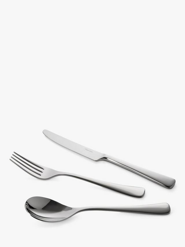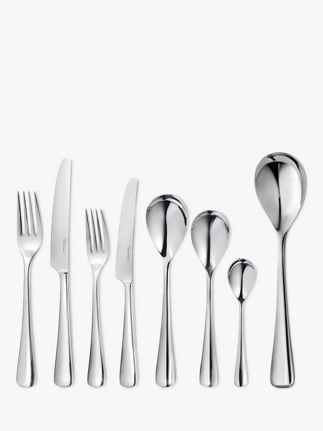 Этот элегантный и неподвластный времени набор из 84 столовых приборов, вдохновлённый очертаниями близлежащих холмов города Вустершир, где он вырос, разработан Робертом Уэлчем. Изделия плавно расширяются к изогнутому основанию. Ручки прочные и удобно лежат в руке.