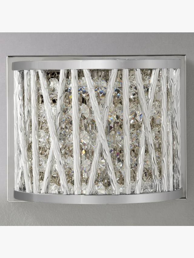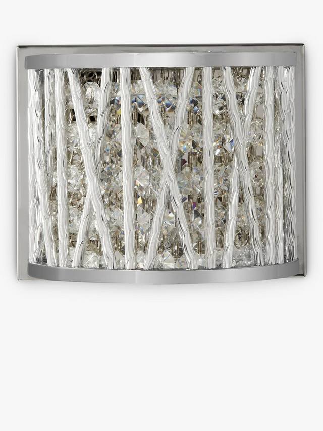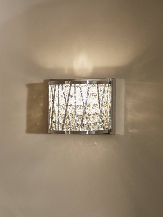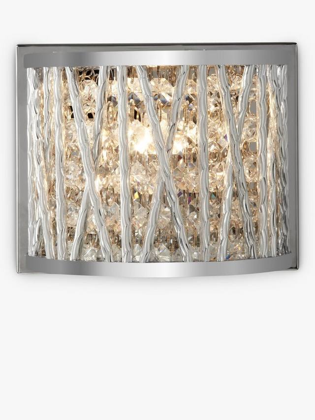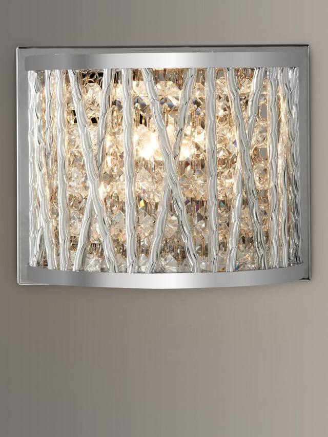 Этот настенный светильник окружен слоями хрустальных бусин. Каждая линия капель подвешена к хромированной конструкции, создавая эффект занавеса. При включении свет проникает сквозь грани, создавая на стенах прекрасную цветовую гамму. Он идеально подходит для придания гламура вашему интерьеру.