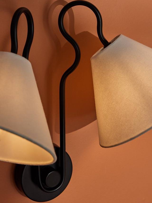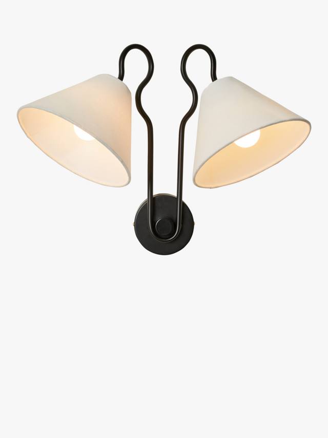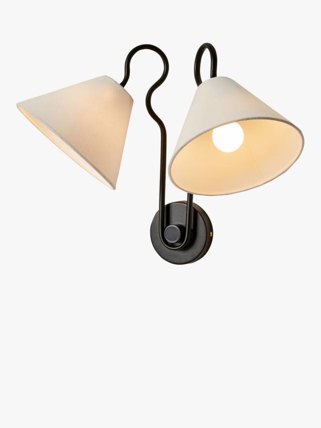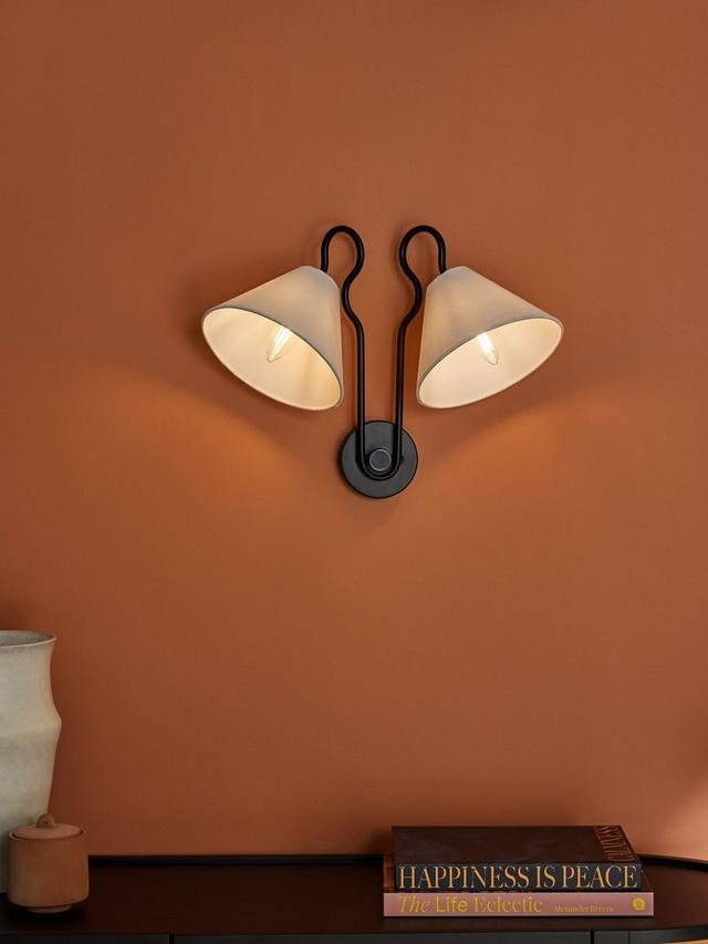 Этот двухрожковый настенный светильник изготовлен из металла с двумя тканевыми абажурами и освещает вашу стену теплым светом.