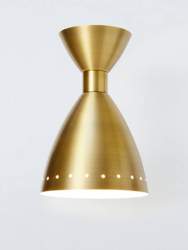 Светильник имеет металлическое основание диаметром 12,5 см (5 дюймов) с изогнутым вверх латунным стержнем из античной латуни. Металлический конусообразный абажур украшен отверстиями, которые создают уникальные световые узоры в вашей комнате.