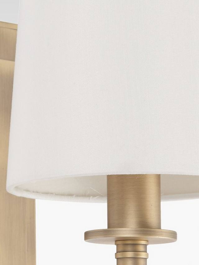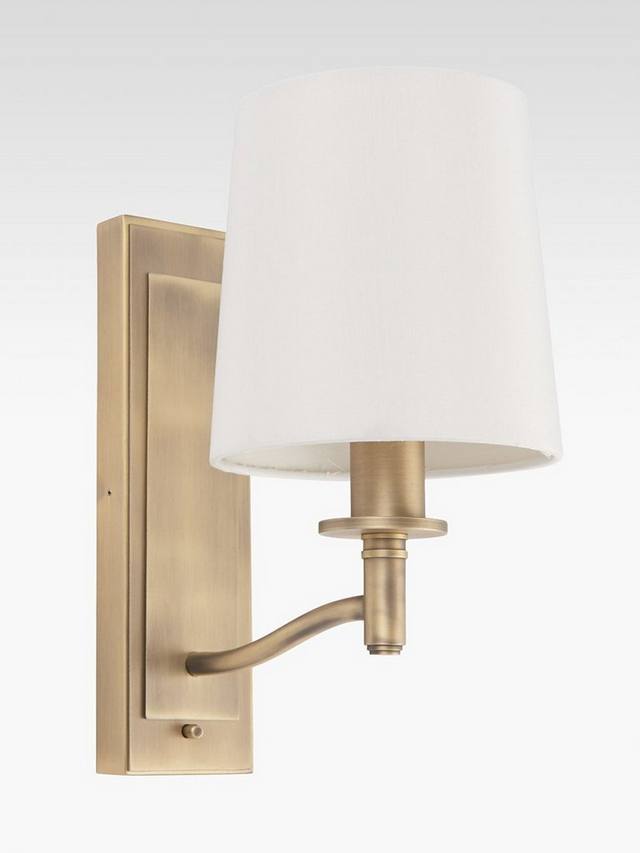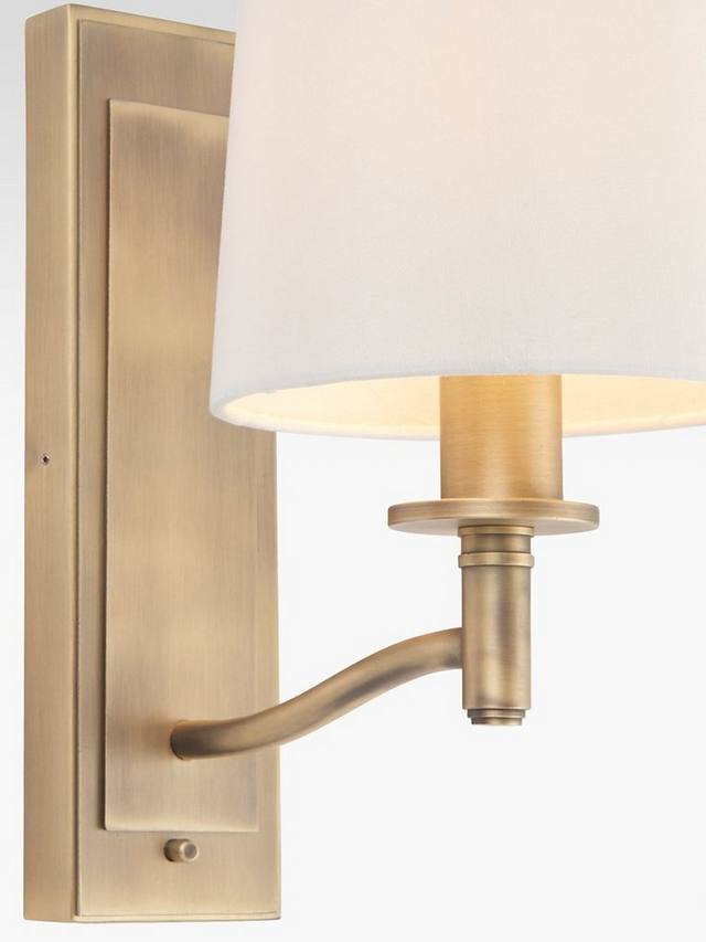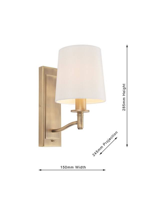 Этот настенный светильник с традиционным дизайном, сочетающим матовую старинную латунь с винтажным абажуром из искусственного шелка, излучает теплый свет и легко управляется с помощью простого переключателя.