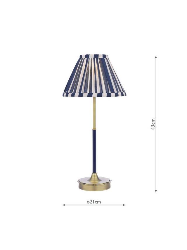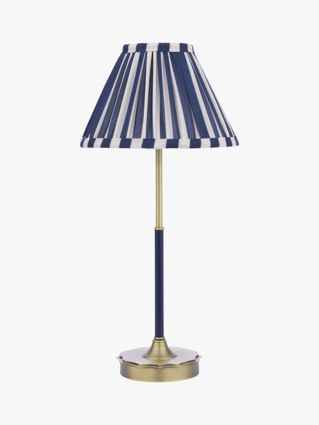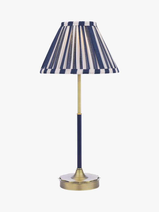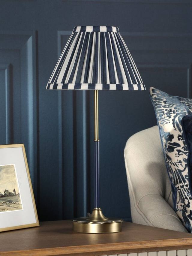 Элегантная и неподвластная времени настольная лампа Laura Ashley Denwick с двухцветным абажуром в тёмно-синюю и кремовую полоску создаёт классический, но в то же время современный образ. Основание и детали из состаренной латуни придают лампе лёгкий винтажный шарм, украшая любую комнату.