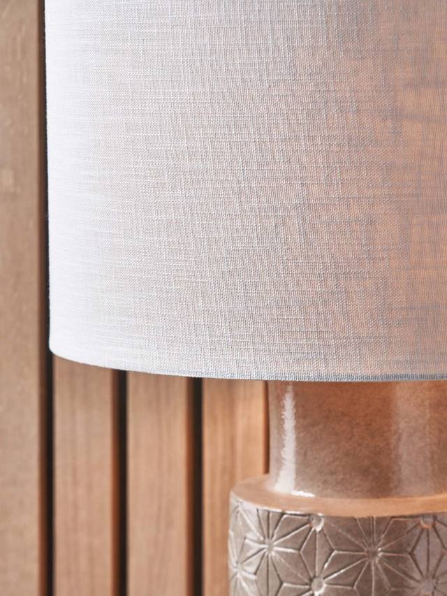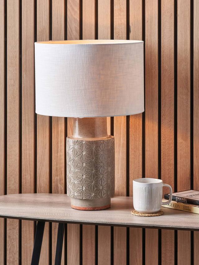 Настольная лампа из керамической плитки Sidra изготовлена вручную на Филиппинах и украшена современным гравированным узором в виде звезд. Увенчан абажуром с подкладкой и открытым плетением, который пропускает свет.
