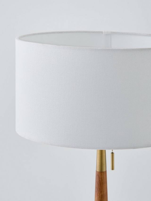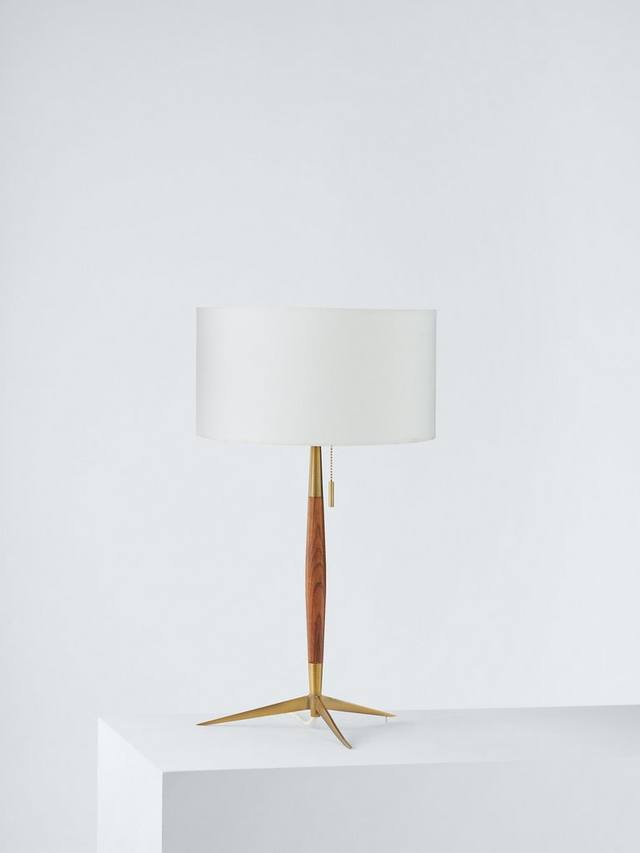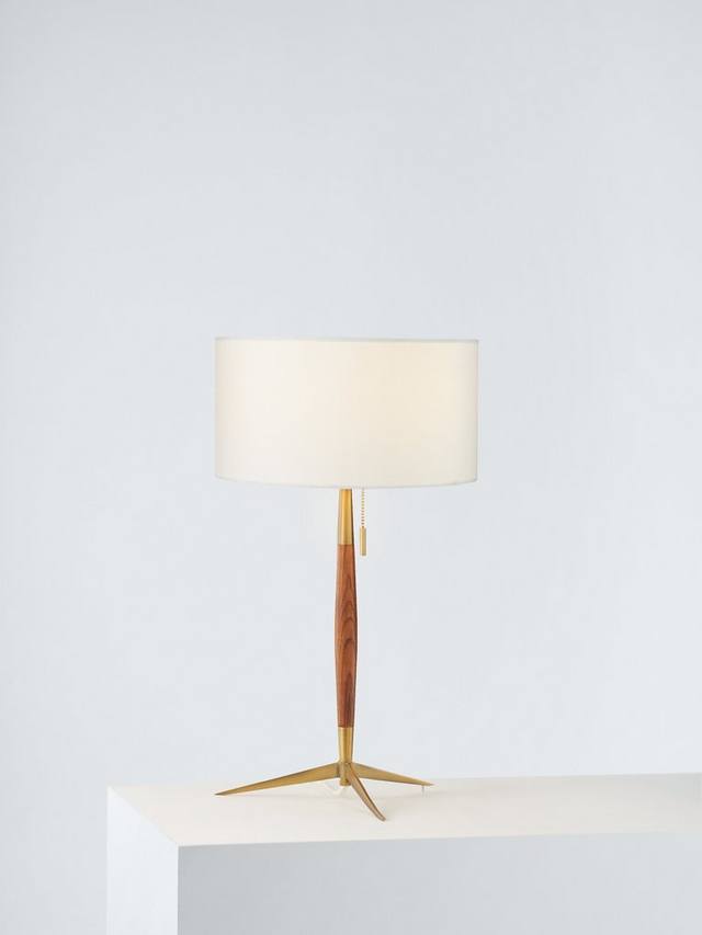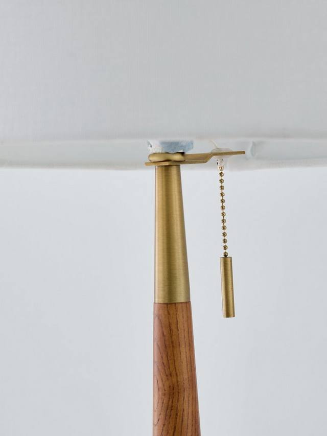 Основание этой настольной лампы изготовлено из окрашенного под орех ясеня и дополнено деталями из матовой латуни. Мы спроектировали его в эстетике середины века. Гладкая веретенообразная рама и основание в виде треноги не займут много места на вашей поверхности, а льняной абажур создаст тёплый поток света.