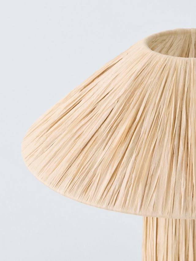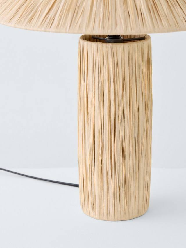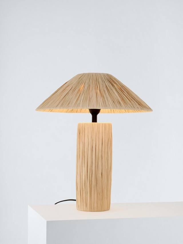 Эта настольная лампа, изготовленная вручную в Индии, оснащена абажуром и основанием, обвитыми рафией, что создаёт уникальный и уютный образ, идеально подходящий для гостиных и спален.