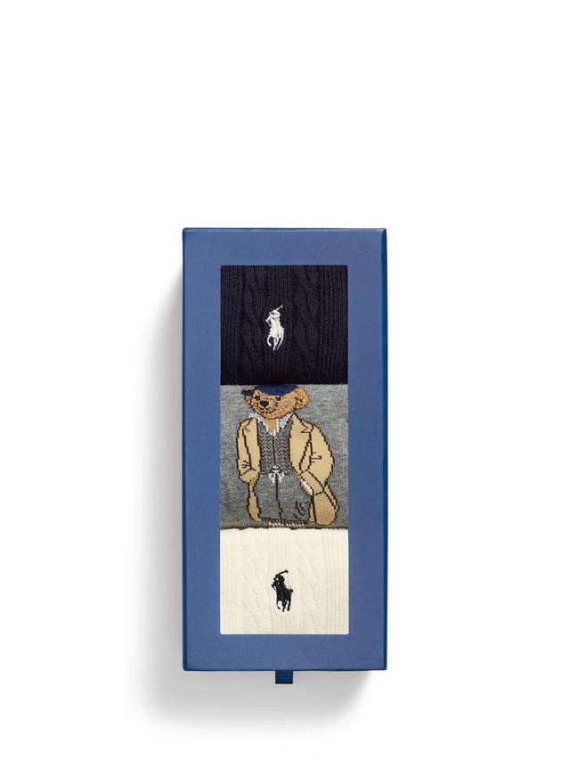 Подарочный набор из 3 пар носков Polo Bear Crew. Этот мягкий комплект из смесовой хлопковой ткани, представленный в фирменной подарочной коробке, включает три пары носков: одни с изображением медведя Polo Bear и две пары вязаных косичками с вышитым на внешней стороне фирменным пони.