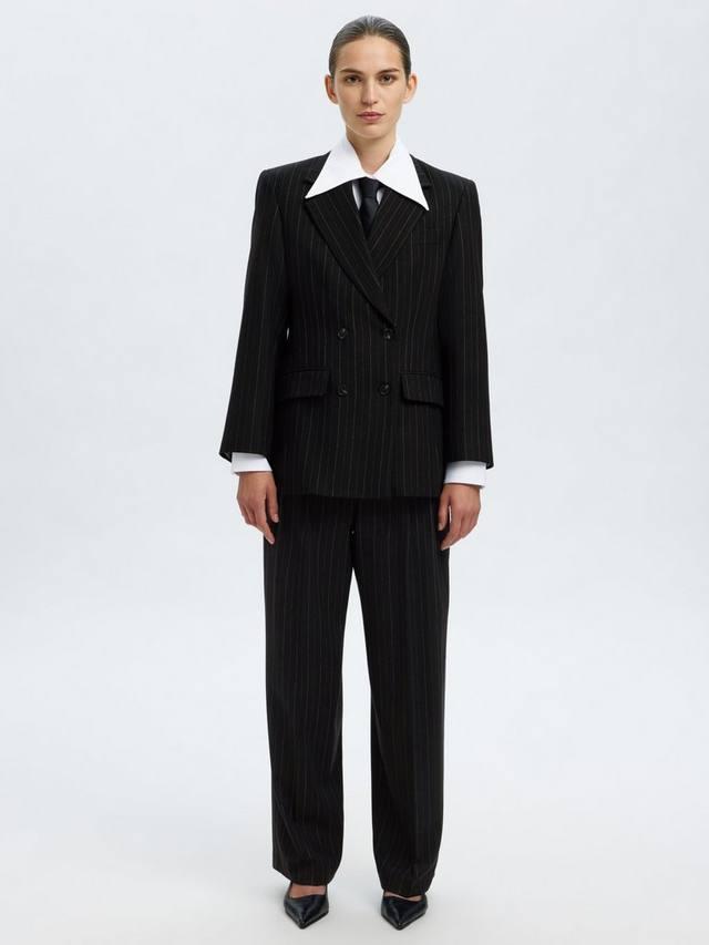 Этот двубортный блейзер сочетает в себе четкие полоски и удлиненный крой, создавая стильный образ как для работы, так и для повседневной носки. Умелое использование эластичной ткани обеспечивает комфорт в течение всего дня, а воротник и отделка на пуговицах добавляют изюминку вашему образу.