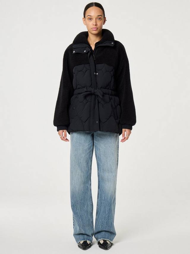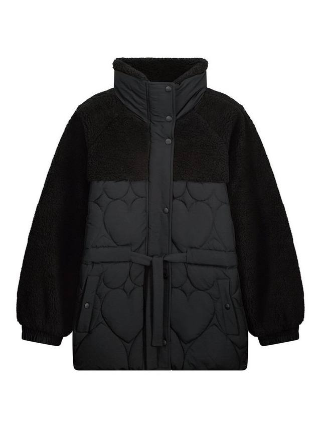 Это стеганое пальто согреет вас и обеспечит комфорт благодаря игривому сердечку и продуманной текстурированной отделке. Воротник-труба и надежная застежка помогут вам уверенно переносить холодные дни, а прямой крой добавит универсальности вашему повседневному гардеробу.