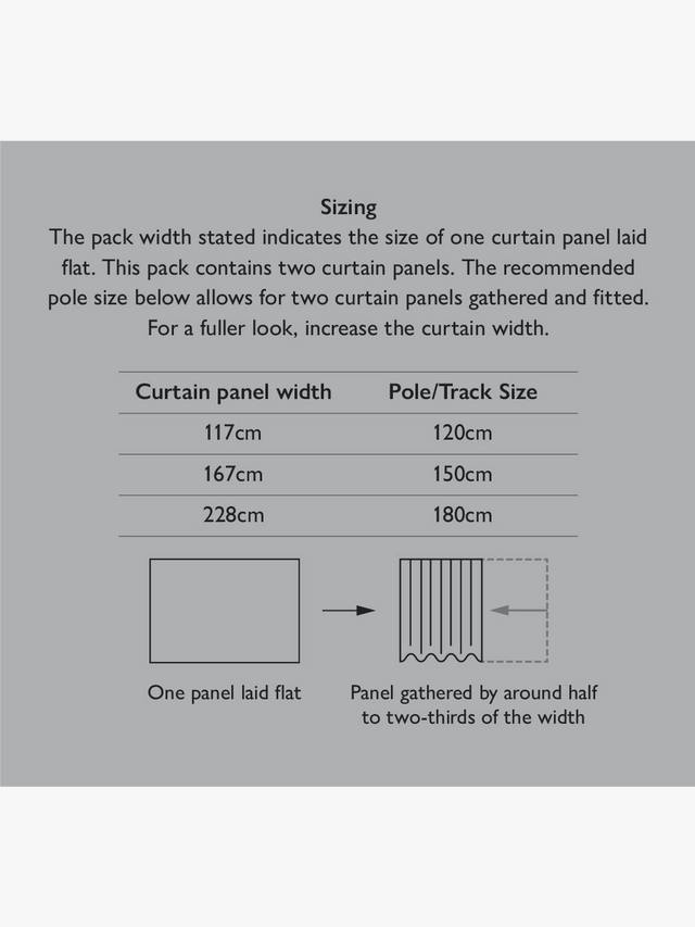 Одна пара штор шириной 117 см подойдет для карниза/стержня размером 117–167 см.Одна пара штор шириной 167 см подойдет для карниза/стержня размером 133–167 см.Одна пара штор шириной 228 см подойдет для карниза/стержня размером 182–228 см.Полезно знать...