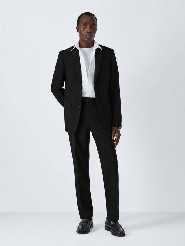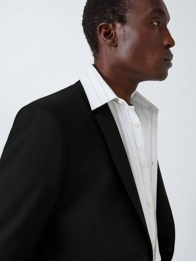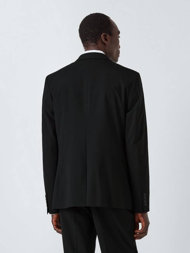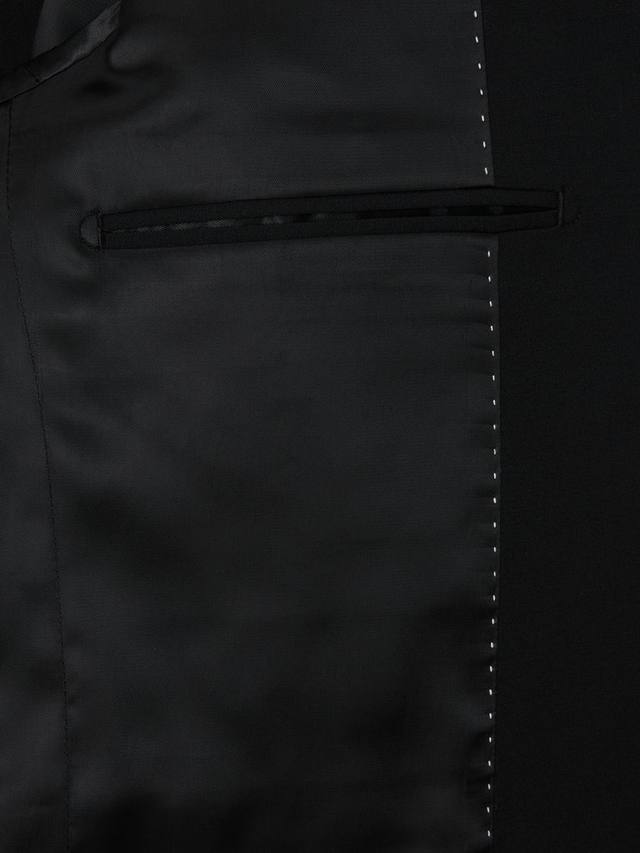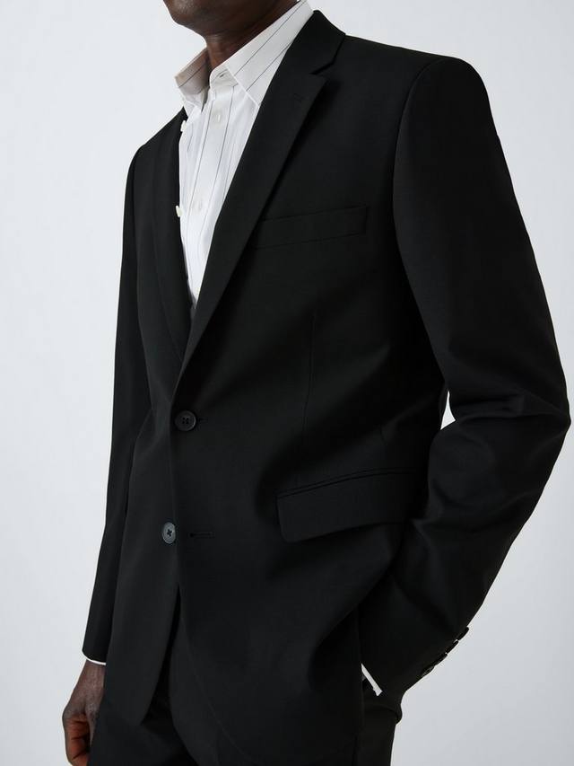 Костюмный блейзер из смесовой шерсти, сшитый по нашей спецификации облегающего кроя, доступен в черном цвете с двумя внутренними карманами.