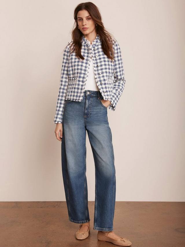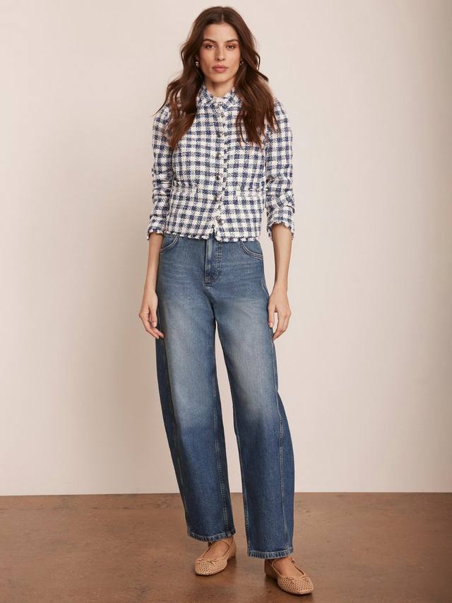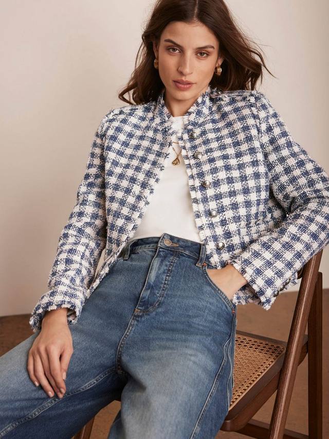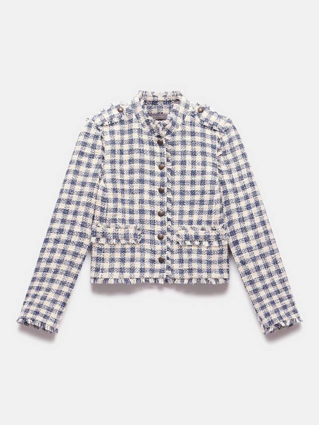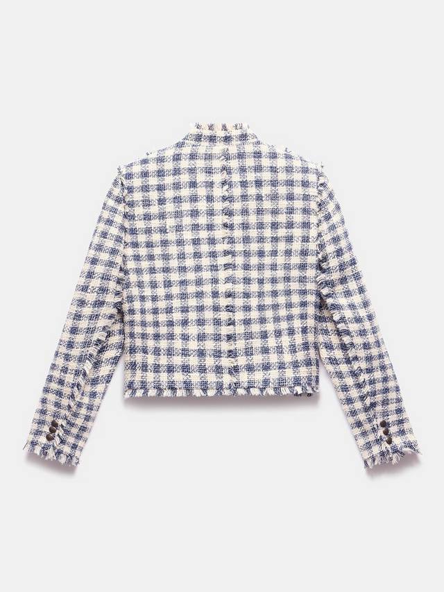 Клетчатый жакет из букле с необработанным краем, воротником Неру, эполетами, длинными рукавами, манжетами на пуговицах, прорезными карманами и застежкой на пуговицы в стиле милитари спереди.