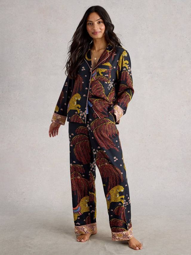 Пижамная рубашка с контрастным принтом на манжетах и небольшими цветными вставками и вышивкой.