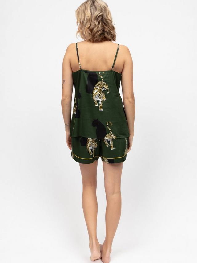Расслабьтесь со стилем в этом невероятно мягком комплекте из хлопка и модала: майка и шорты с ярким леопардовым принтом и отделкой из модала. Топ на майке имеет глубокий V-образный вырез, регулируемые бретели и удобную посадку, подчеркивающую фигуру. Шорты имеют плоский перед, эластичную талию сзади, регулируемый шнурок, два боковых кармана и глубокие манжеты по низу для непринужденного и элегантного образа.