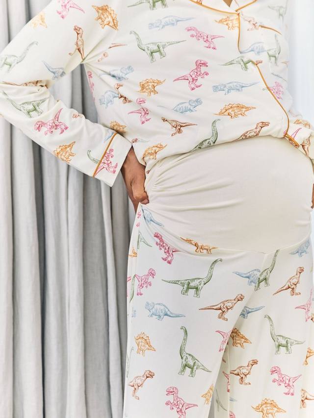 Всем любителям динозавров! От тираннозавра до трицератопса — дайте волю своему внутреннему палеонтологу в этой мягкой короткой пижаме из переработанного трикотажа. Этот удобный комплект, состоящий из рубашки с длинными рукавами, застегивающейся на пуговицы, и соответствующих пижамных штанов, обеспечивает идеальную посадку на протяжении всей беременности.