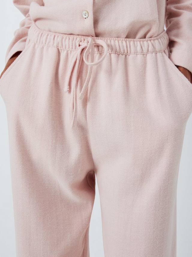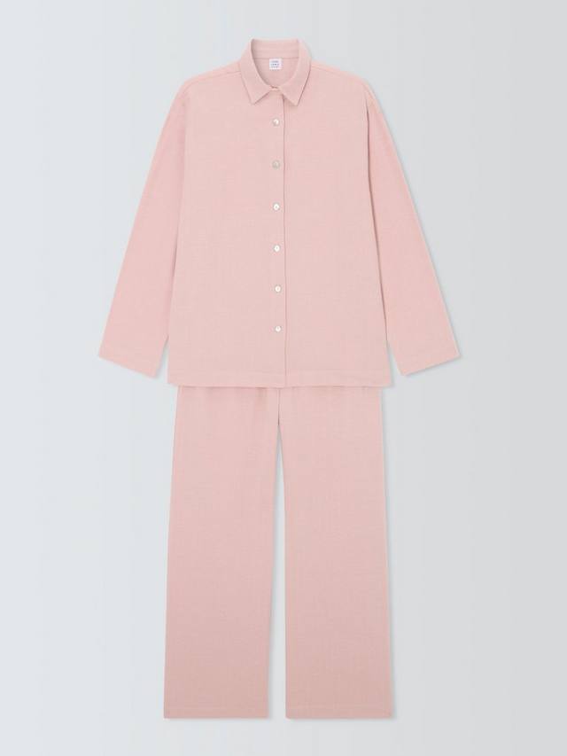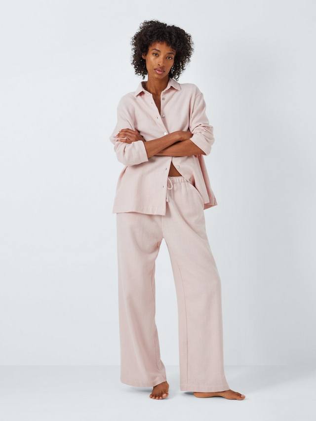 Этот пижамный комплект из чистого хлопка с классической текстурой ёлочка состоит из двух частей. Верхняя часть имеет элегантный воротник и обтянутые тканью пуговицы, а нижняя — полностью эластичный пояс со шнурком и удобными боковыми карманами.
