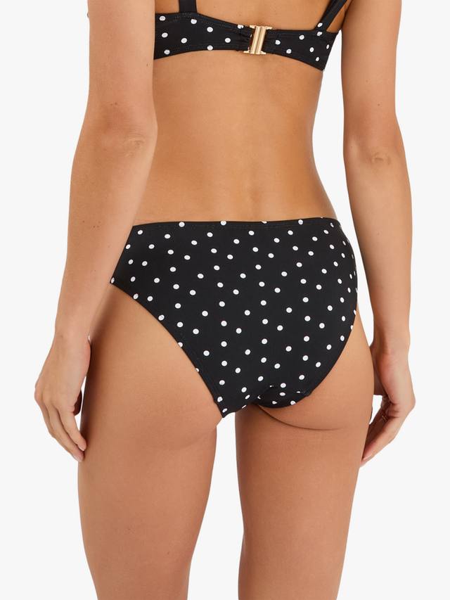 Эти плавки-бикини с классическим рисунком в горошек имеют укороченный фасон с золотистыми деталями по бокам.
