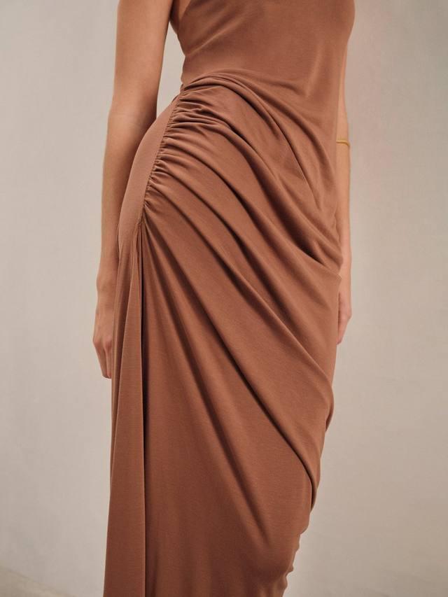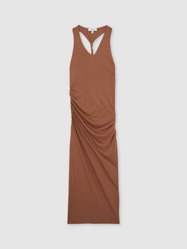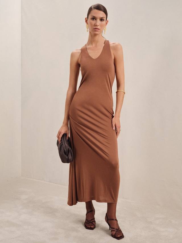 Это миди-платье от Reiss, выполненное из эластичной вискозной смеси с простым, но эффектным силуэтом, облегающим фигуру, выполнено из эластичной вискозы. Модель с V-образным вырезом, перекрученной спинкой и сборкой спереди.
