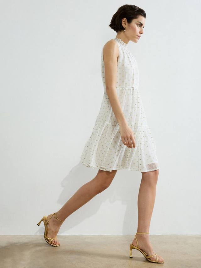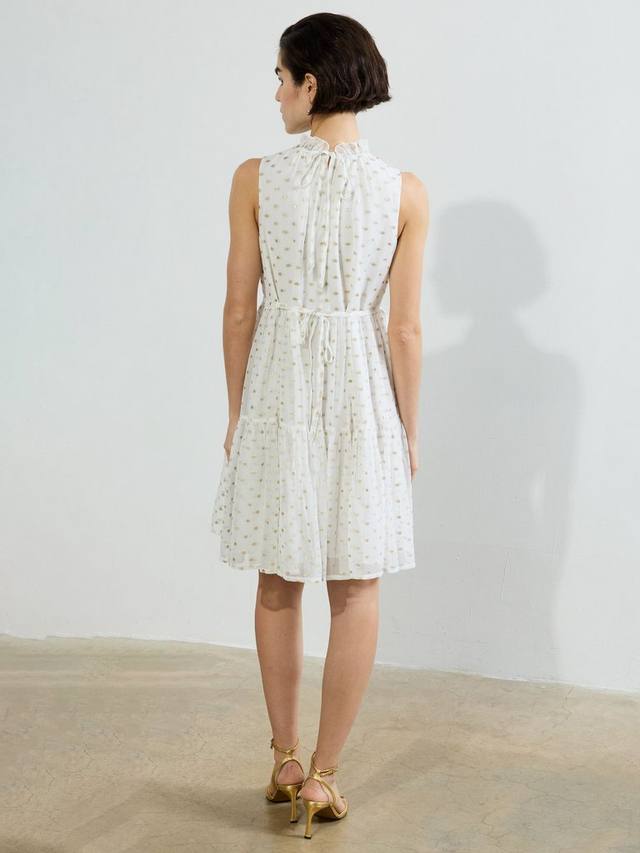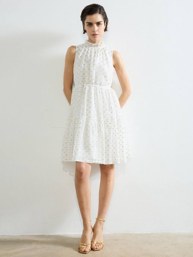 Жаккардовое многоярусное платье Arlo добавит гламурности летнему наряду. Это платье – незаменимая вещь в летнем гардеробе. Роскошный горошек украшает прозрачный верх от высокого оборчатого выреза до струящейся многоярусной юбки. Пояс в тон завязывает платье, создавая идеальную посадку. Днем его можно носить с сандалиями, а на торжественных мероприятиях – с каблуками и эффектными серьгами.