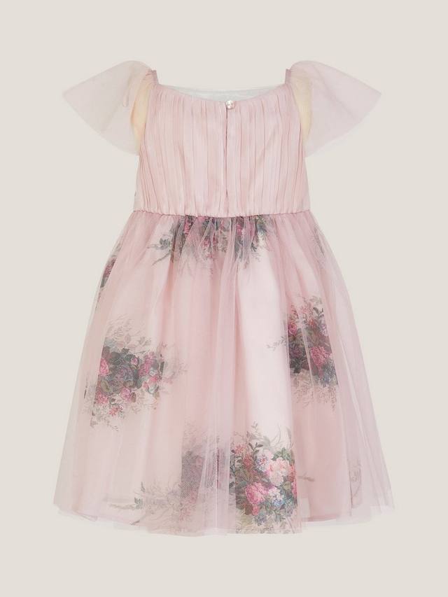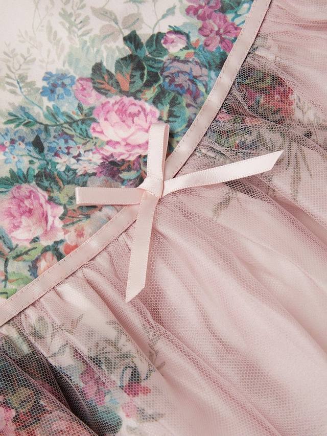Это милое розовое платье украшено винтажным цветочным принтом и сетчатым слоем поверх пышной юбки. Короткие рукава и милый бант из ленты на талии.