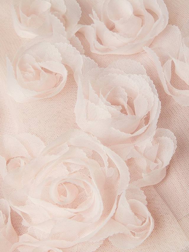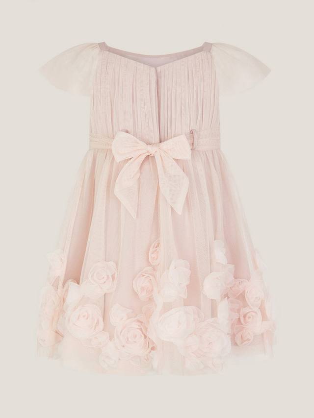 Это очаровательное платье с сетчатым верхним слоем украшено аппликацией с цветочным принтом по подолу и бантом на талии.
