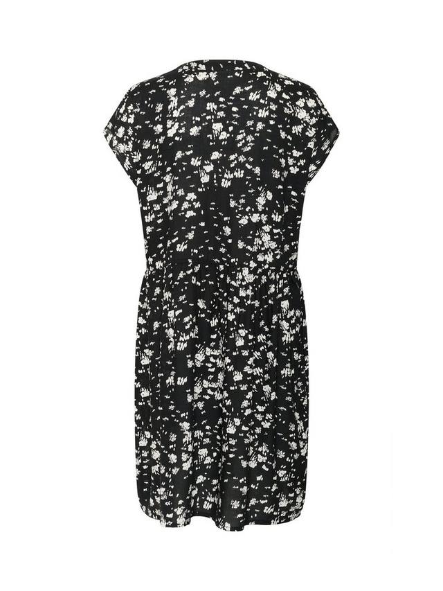 Это платье от KAFFE, облегающее по фигуре и доходящее до бедра, выполнено из воздушной вискозной ткани с простым круглым вырезом, короткими рукавами и абстрактным принтом по всей поверхности.
