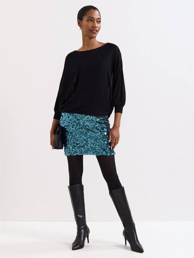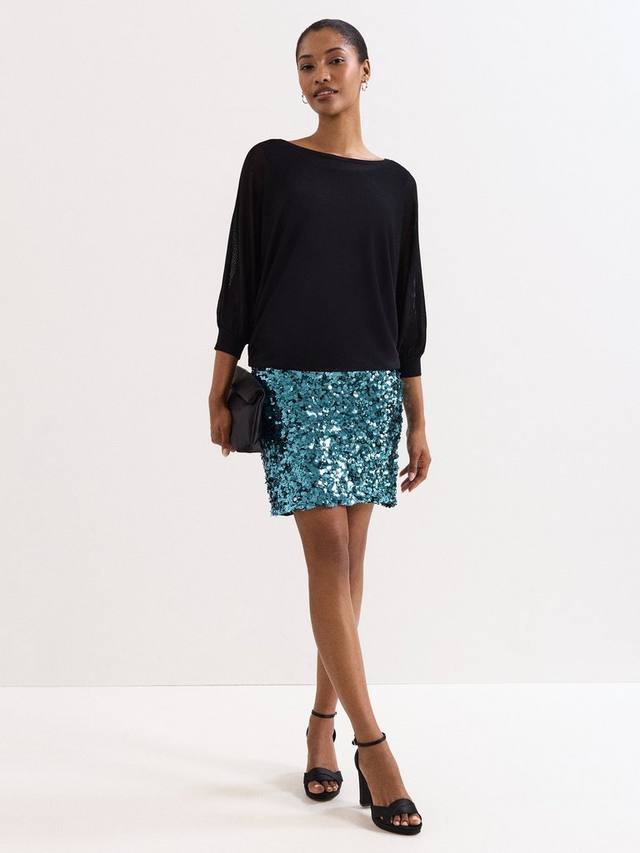 Мини-платье для вечеринки с мерцающими пайетками, выгодно подчеркивающим вырезом лодочка и рукавами три четверти. Удобное и эффектное платье для любого торжества.
