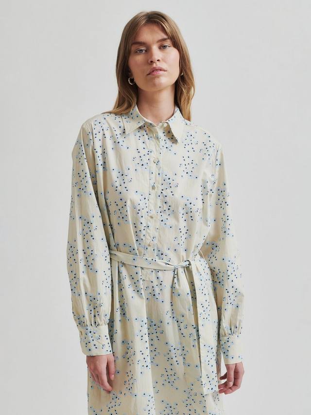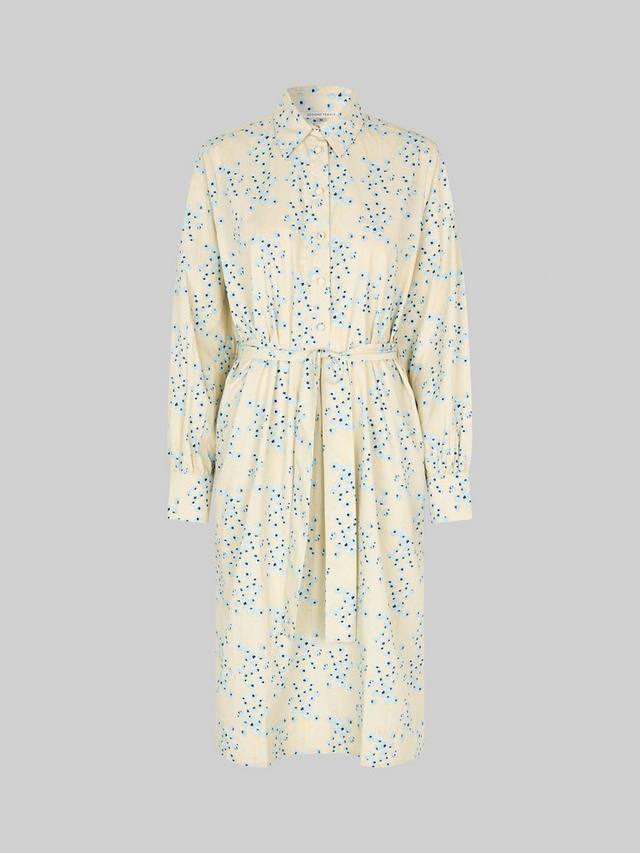 Платье-рубашка выполнено из легкого и гладкого органического хлопка с цветочным узором по всей поверхности. Имеет стандартный воротник и полупланку с застежкой на обтянутые пуговицы. Съемный тканевый пояс на талии. Длинные рукава с манжетами на пуговицах. Два боковых кармана в швах. Разрезы по бокам. Свободный прямой фасон, который можно застегнуть поясом.