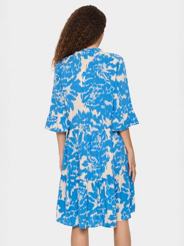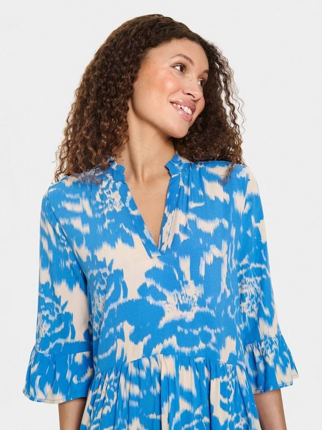 Это многоярусное платье длиной до колена от Saint Tropez выполнено из воздушной вискозной ткани, придающей образу эффектный вид. Благодаря лаконичному, но элегантному V-образному вырезу и рукавам длиной три четверти, эта модель привлекает внимание абстрактным принтом.