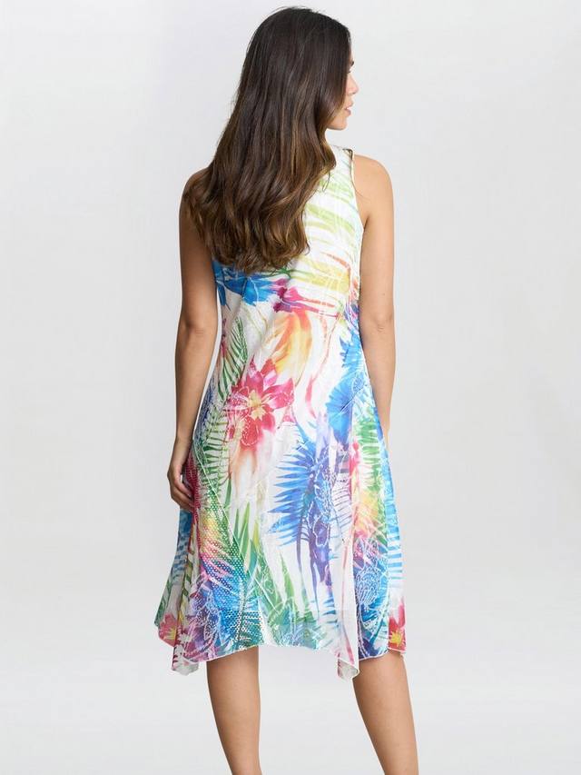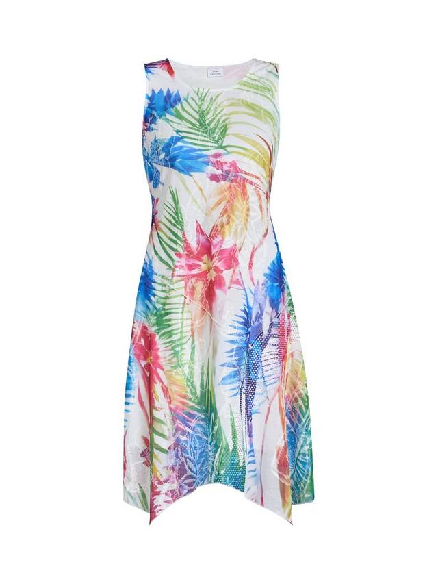 Это яркое и воздушное платье без рукавов украшено смелым принтом в тропическом стиле. В дизайне присутствуют нотки абстрактных текстур, что придает ему свежий и летний вид. Платье имеет выгодный А-образный силуэт, струящийся и комфортный. Идеально подходит для мероприятий в теплую погоду, праздников и повседневных прогулок.