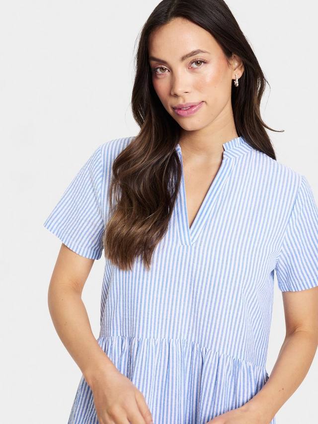 Это платье средней длины из Сен-Тропе, с ярусами по талии, выполнено из лёгкого, дышащего хлопка. Модель с вертикальными полосками, V-образным вырезом и короткими рукавами, идеально подходит для фигуры.