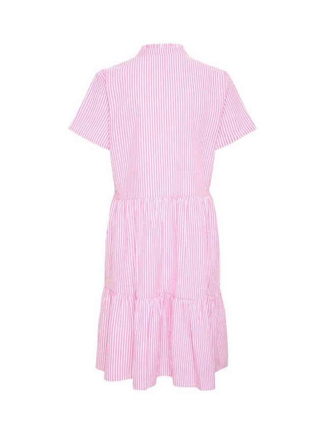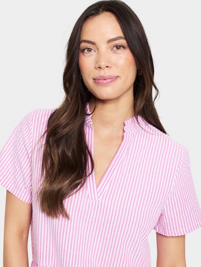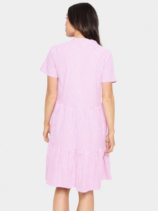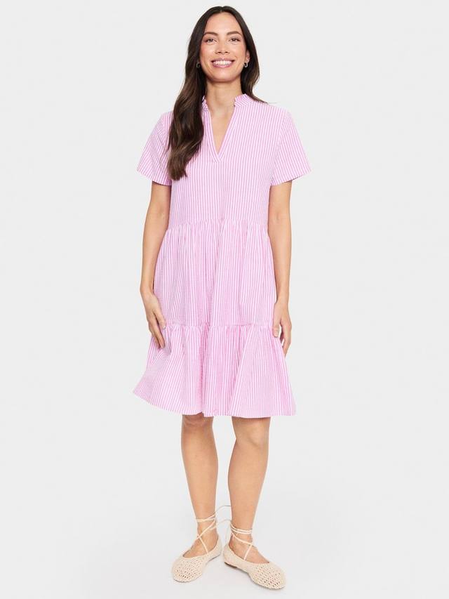 Это платье средней длины из Сен-Тропе, с ярусами по талии, выполнено из лёгкого, дышащего хлопка. Модель с вертикальными полосками, V-образным вырезом и короткими рукавами, идеально подходит для фигуры.