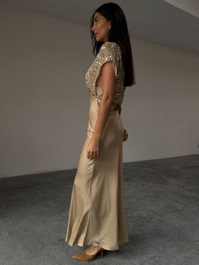 Тонкий сетчатый верх, украшенный роскошным жемчугом и пайетками, вплетенными в ткань, прекрасно контрастирует с лёгким атласом, создавая элегантный силуэт, идеально подходящий для любого случая. Дополнив образ клатчем с бисером и каблуками, вы создадите идеальный образ для гостей на свадьбе.