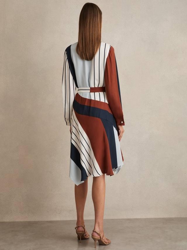 Это платье длиной до колена от Reiss, скроенное с запахом спереди, выполнено из струящейся вискозы. Благодаря лаконичному, но элегантному V-образному вырезу и длинным рукавам, эта модель привлекает внимание современным абстрактным принтом.