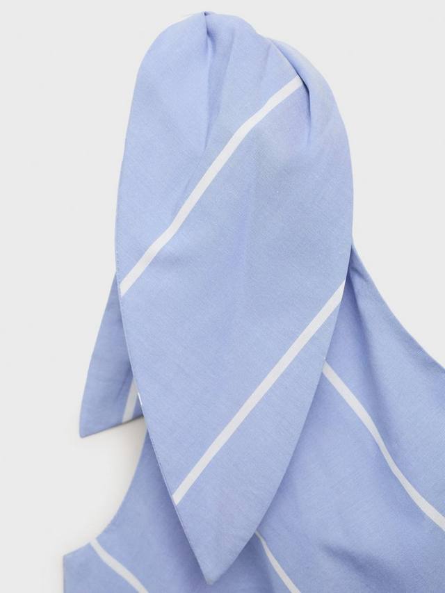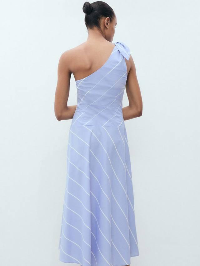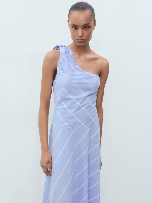 Потому что простой А-силуэт всегда в моде. Это платье миди из чистого хлопка от Mango с асимметричным вырезом, украшенным бантом, и принтом в виде перекрещивающихся полосок.