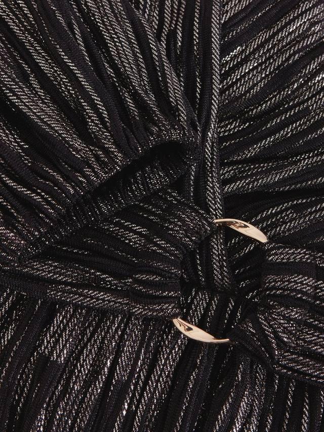 Встречайте ваше новое любимое платье для мероприятий. Его главная изюминка — ткань с металлизированными полосками, которая превращает этот фасон в уникальный, но современный предмет гардероба, к которому вы будете тянуться снова и снова. Платье женственного силуэта обманка с классическим V-образным вырезом, рукавами-блузоном и завязкой на талии. Дополните образ подходящими туфлями и клатчем.