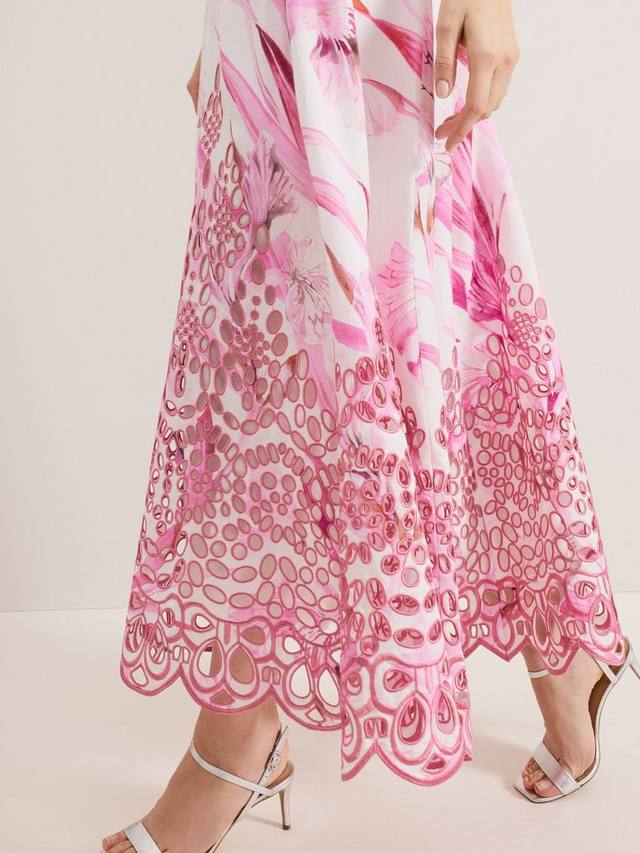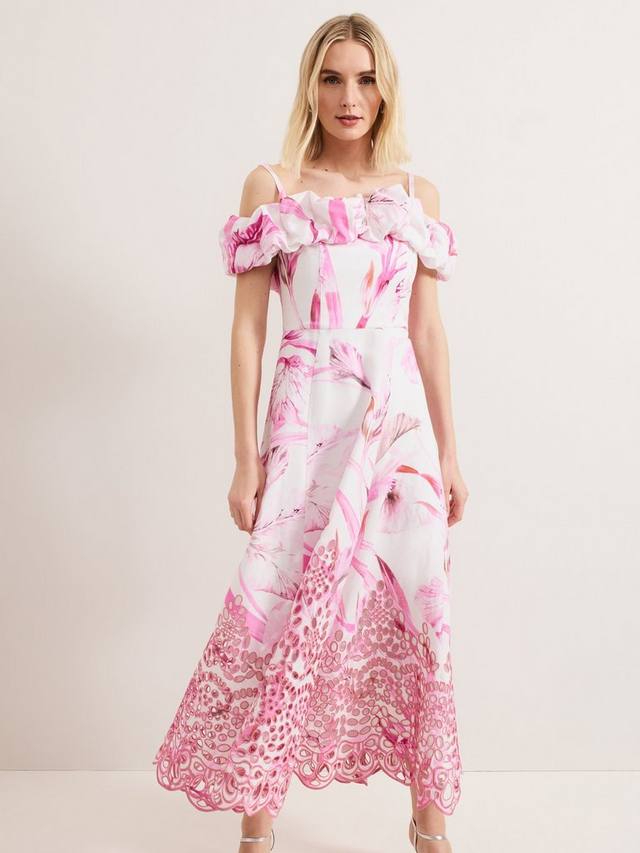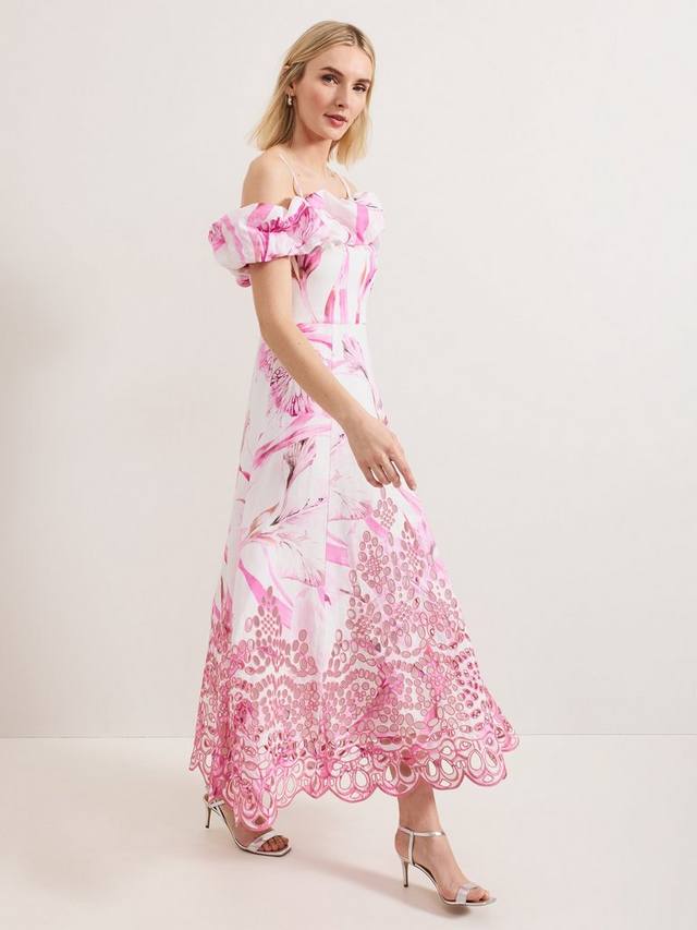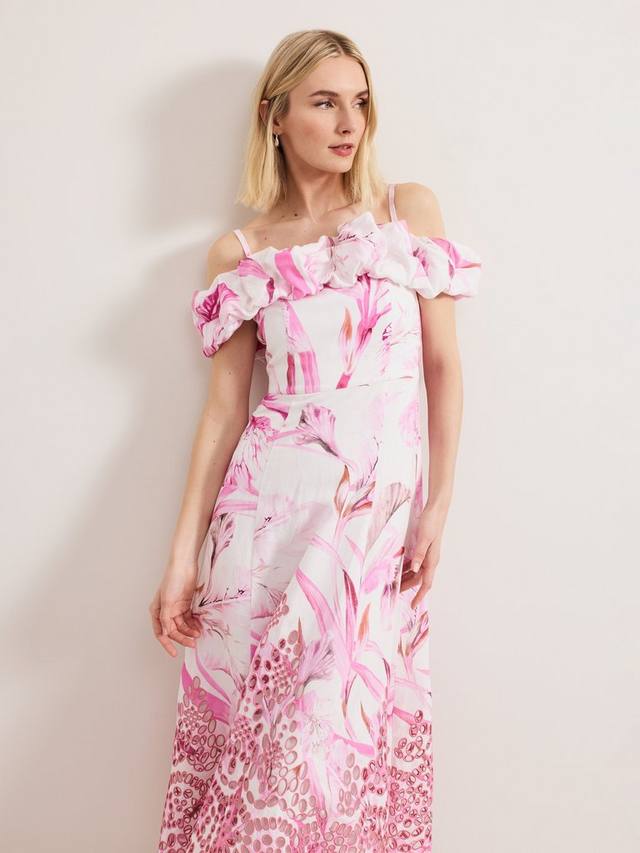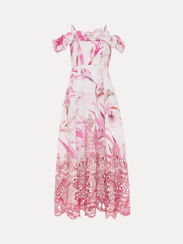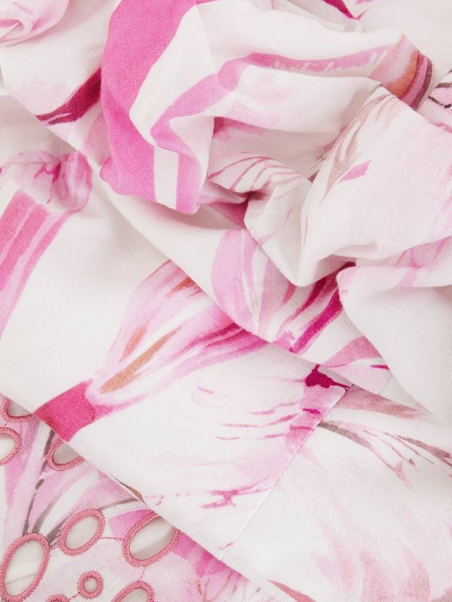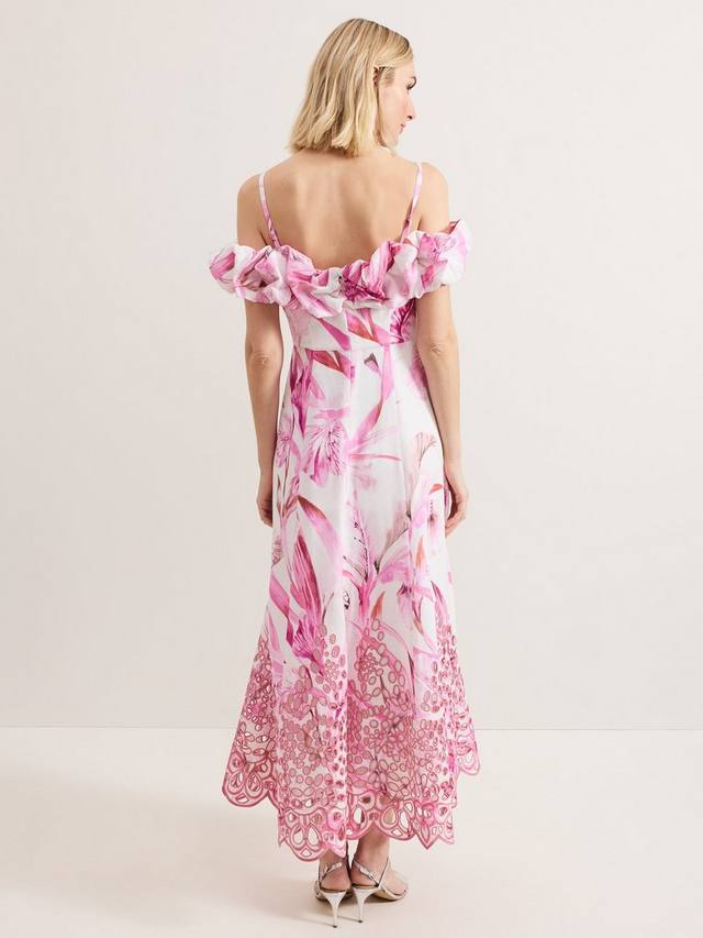 Платье Esme с потрясающим цветочным узором привлечёт внимание на любом мероприятии. Оборки на вырезе Бардо добавляют объёма, а замысловатая ажурная отделка на струящейся юбке миди создаёт современный и женственный образ. Дышащая льняная ткань делает его идеальным для летних мероприятий и отпуска. Просто дополните его любимыми босоножками или туфлями на каблуке.