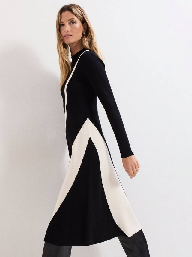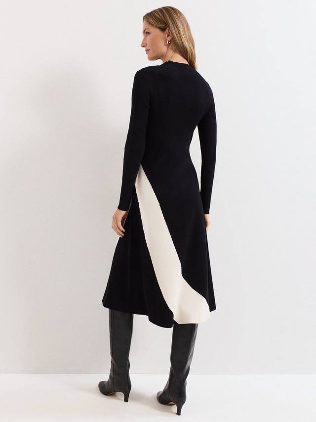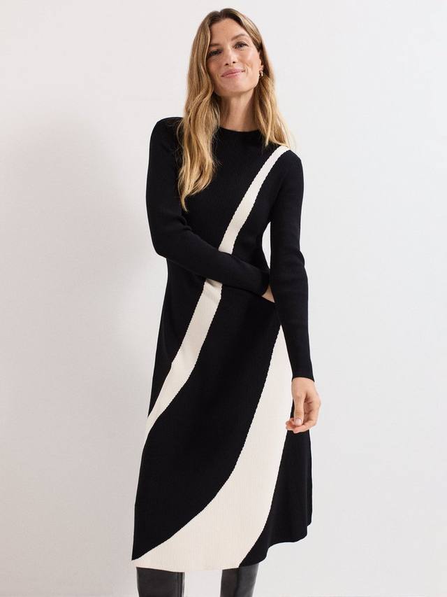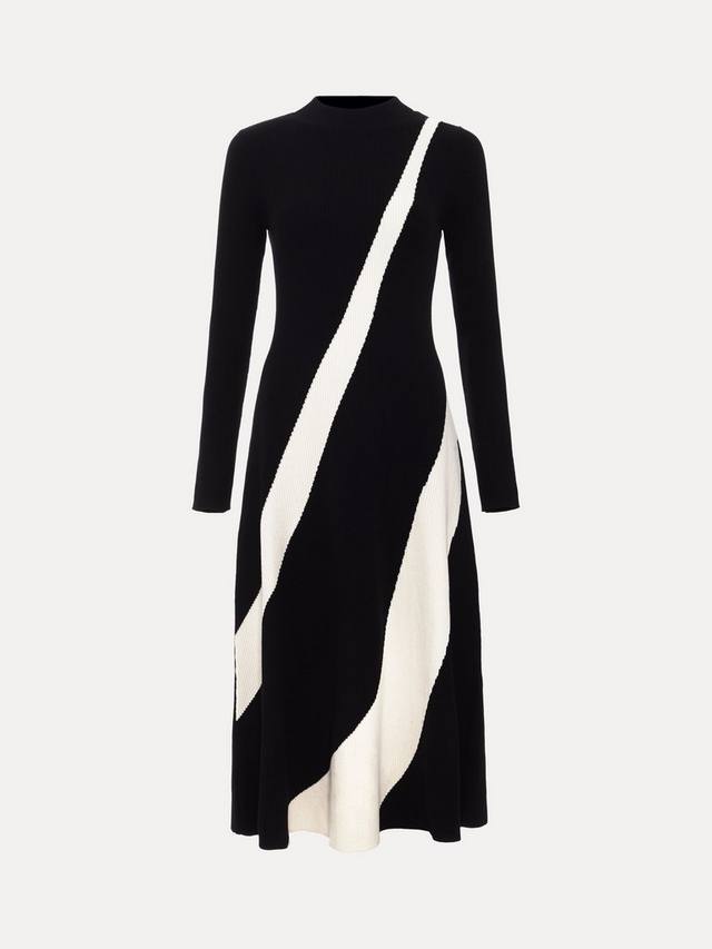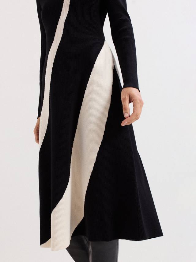 Это трикотажное платье достойно места в каждом гардеробе. Мягкая ребристая текстура дополнена принтом в виде завитков, создающим стильный контраст. Благодаря расклешенному силуэту миди, мы любим сочетать его с сапогами, создавая образ, который будет уместным как в офисе, так и на ужине или в баре.