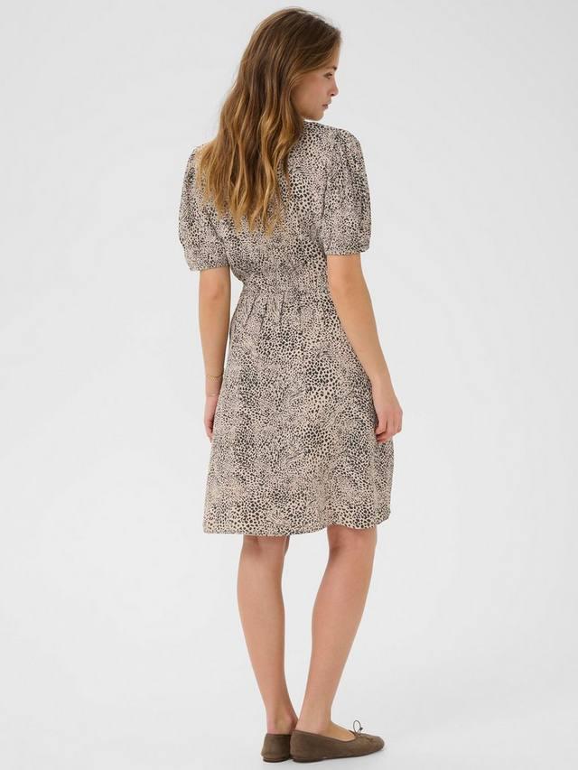 Создайте шикарный и комфортный образ в платье KAliana от KAFFE с абстрактным леопардовым принтом, короткими рукавами, завязкой на талии и боковыми карманами.