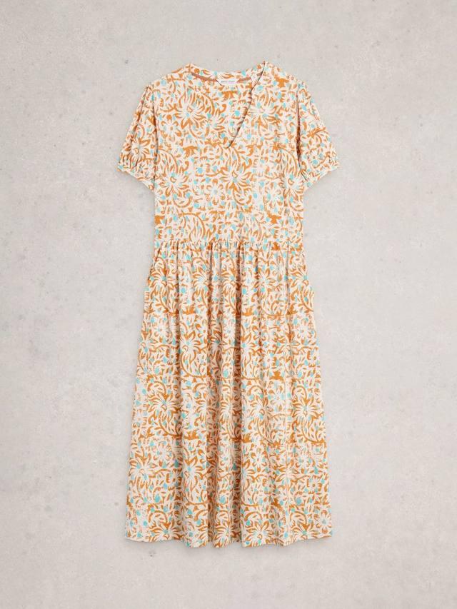 Это платье миди от White Stuff, облегающего кроя и расклешенного по фигуре, выполнено из хлопкового трикотажа. Платье с V-образным вырезом и короткими рукавами украшено абстрактными мотивами.