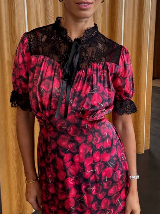 Это облегающее платье макси с расклешенным лифом обеспечит вам комфорт и уверенность в себе на весь день. Игривый вишневый принт и кружевные детали создают привлекательный образ, дополненный изящным завязывающимся воротом.